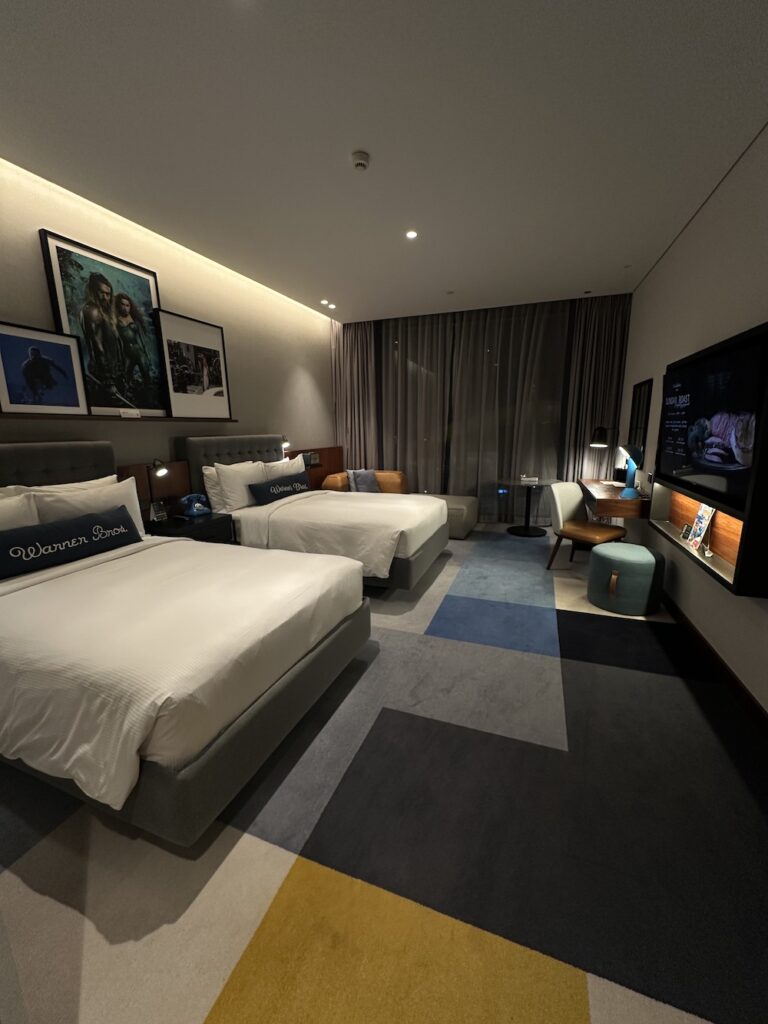 منذ اللحظة الأولى، ستلاحظ حضور شخصيات وعوالم وارنر برذرز في كل زاوية، بدءًا من سيارة باتمان عند المدخل، وصولًا إلى التفاصيل الصغيرة المنتشرة في أرجاء الفندق.