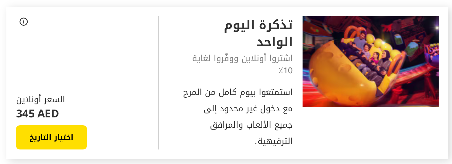 وهنا أسعار التذاكر ليوم واحد، ويمكن الحصول على خصم وعروض جيدة عند شرائها عبر موقعهم + حجز أكثر من منتزه.
